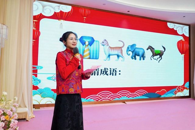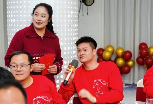 互动现场,猜成语送红包游戏点燃全员热情,欢声笑语中凝聚团队合力。多轮活动深度融入马年元素与家文化,为现场属马员工送上古婺窑火马年生肖杯,工会录制新春祝福视频,派送马年吉祥挂件。集团公司副总裁冯红现场发放《海棠食趣》菜谱,倡导和睦家风,以家文化筑牢企业向心力。由陈洁奕设计的“一路生花”马年贺卡备受瞩目,以梅花、卷草纹、奔腾骏马为创意,寓意生生不息的奋斗精神与刚柔相济的企业品格,为盛会增添浓厚文化底蕴。